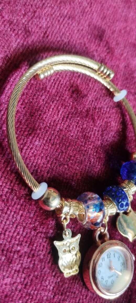 Discover timeless elegance with our charm watch bracelet. Featuring a classic round watch face, this exquisite piece is adorned with gold-tone charms, including an adorable cat and a delicate heart, beautifully complemented by shimmering blue beads. Presented in a chic pink display box, it is the perfect accessory for any occasion or a thoughtful gift for someone special. The bracelet measures approximately 7.5 inches in length and features an adjustable clasp for a comfortable fit. The gold-tone finish adds a touch of luxury, while the playful charms create a unique and stylish look you'll love to wear.
