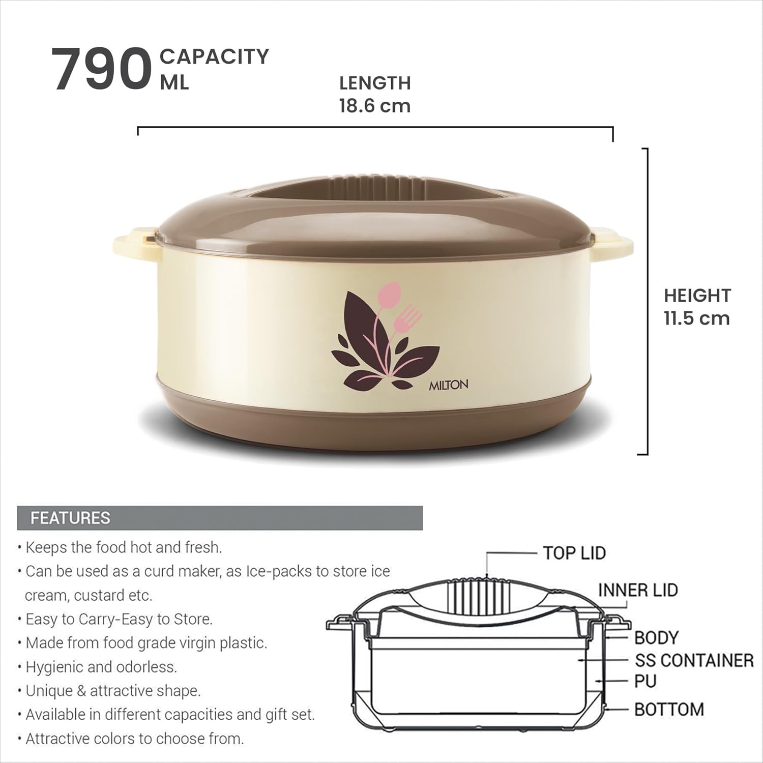 • Made from food grade virgin plastic and from durable quality steel, the functional and leak proof lid of the casseroles with an easy grip which can be opened or shut with a simple motion and trap the heat effectively inside the casserole or hot pot., Hygienic and odourless