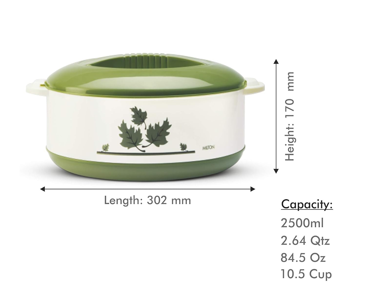 • Colour: GREEN, Material: Inner Stainless Steel; Package Contents: 1 - Piece Orchid Casserole (2360 ml), Dimension in cms (L x W x H): 30.2 x 30.2 x 17.
