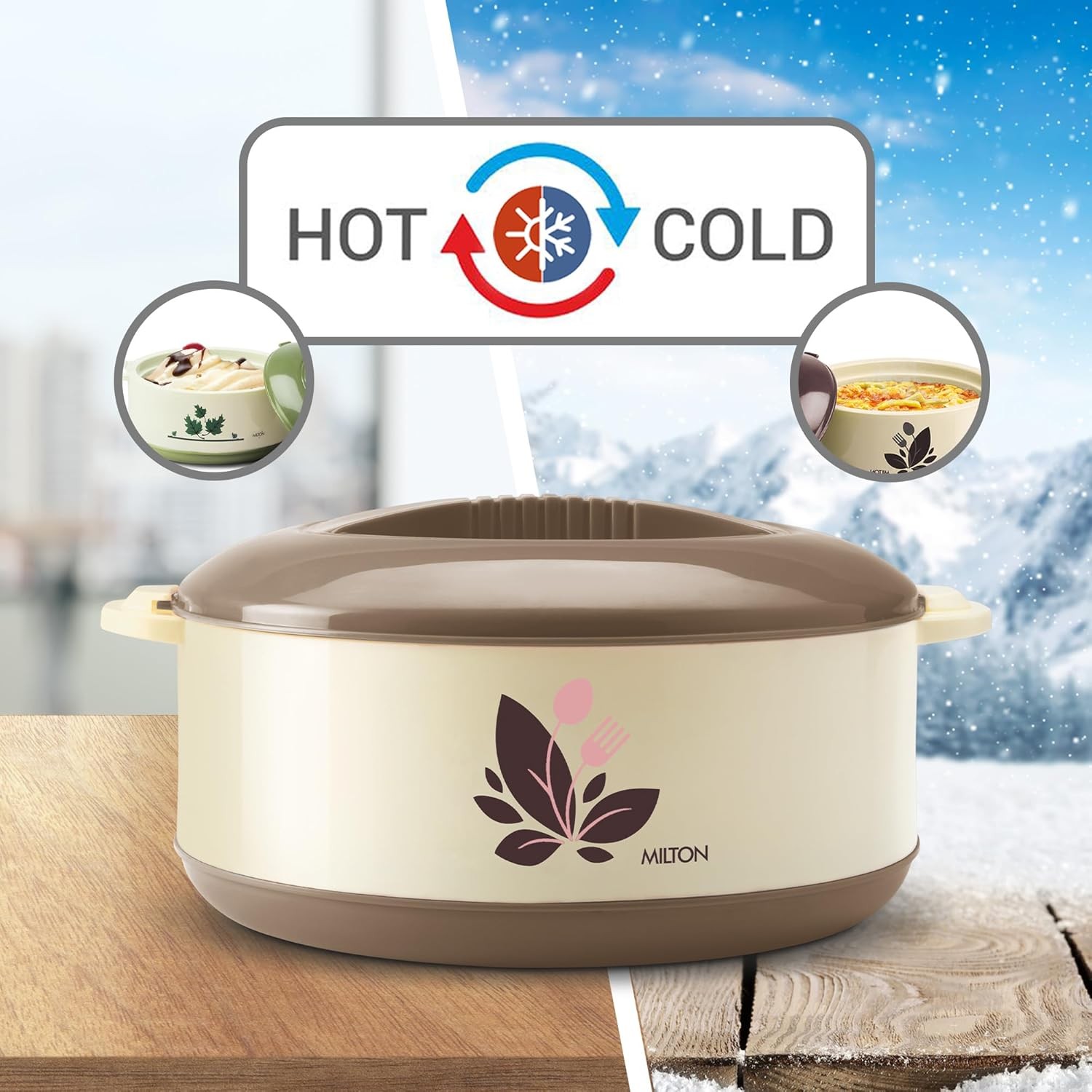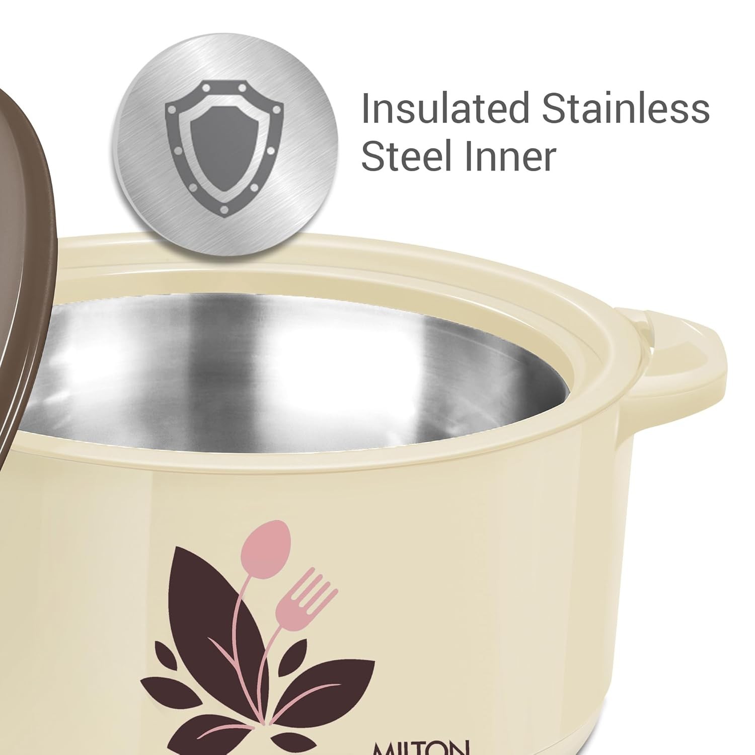 • Contemporary dual-tone outer finish with attractive graphics make mealtimes fun and exciting. Easy to carry from kitchen to dining table with an eye catching design featuring inner stainless steel