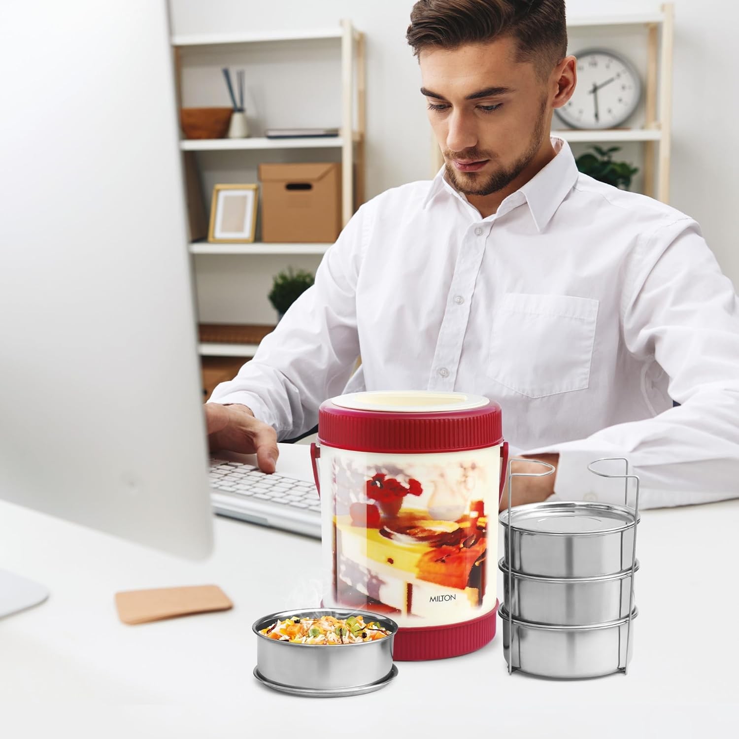 • This Steel tiffin often come with multiple compartments or tiers, allowing you to pack different food items separately. This helps in keeping the food fresh, prevents mixing of flavors, and allows for better organization.