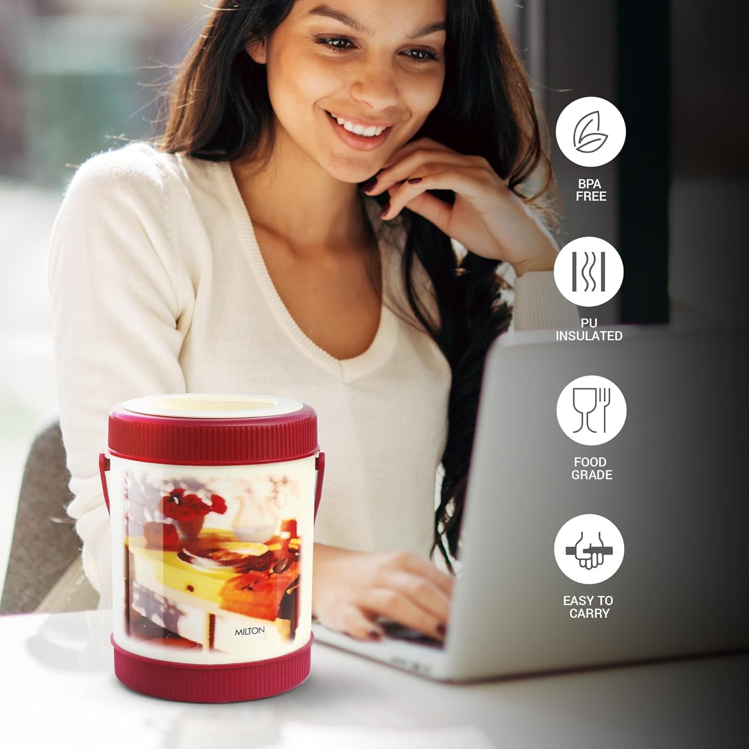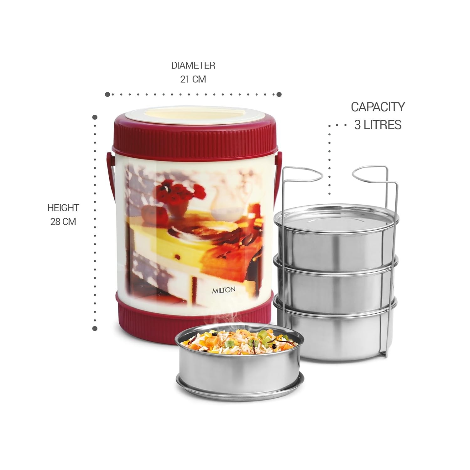 • Color: RED; Material: Container - Steel & Outer - Plastic; Package Content: 1 - Piece Sheriff Lunch Box (3 Litres); Dimension in cms (L x W x H): 21 x 21 x 28