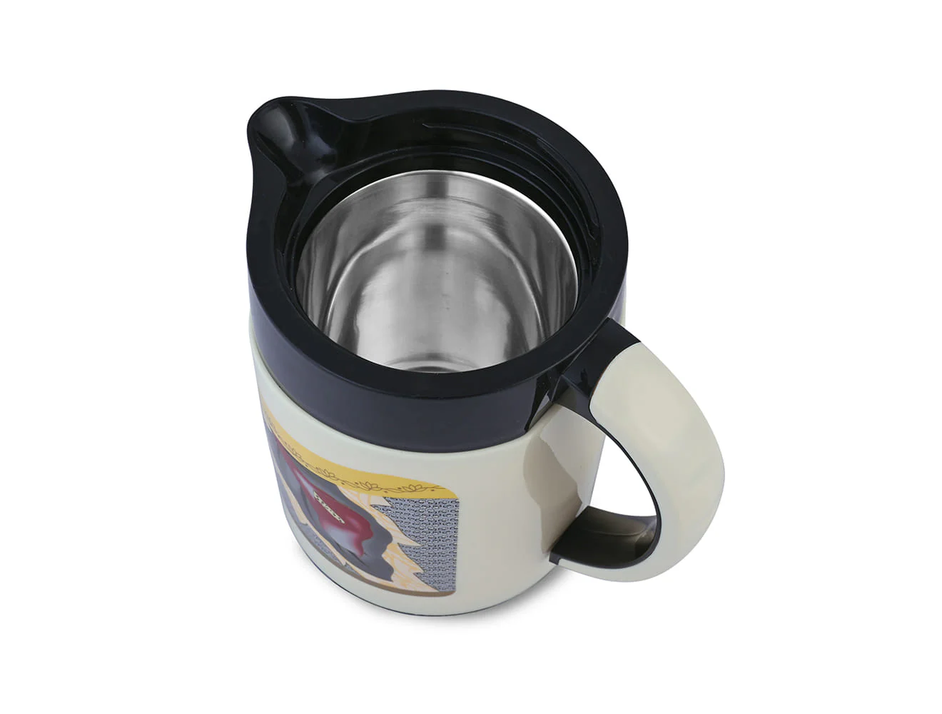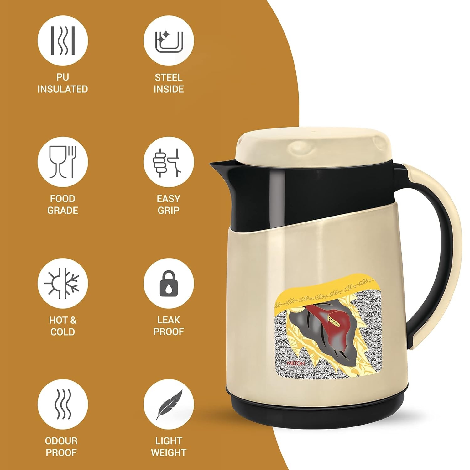 • Contemporary dual-tone finish and body-graphics, wide-mouthed for easy filling and cleaning. It is BPA free, Leak proof, odour proof and light weight. Fill the Jug upto the brim. This ensures maximum heat retention. Pre-condition Jug with hot water if using for HOT beverage and cold water if using for COLD.
